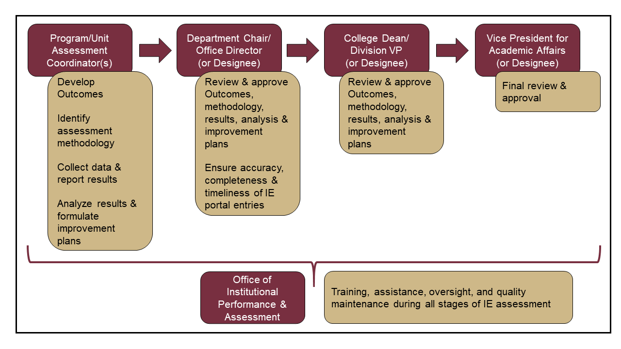 Typically, each unit designates one or two people as assessment coordinators who lead and manage the assessment process and implementations of improvements at the level of their unit. However, it is expected that all members of the unit understand, provide input for, agree with, and participate in the IE process. The IE assessment is a shared responsibility between faculty/staff, the assessment coordinators, the department chair/office director, and the associated dean/division VP. As such, they all are involved in an annual workflow that assures that defined Outcomes are appropriately designed, measured, analyzed, and reported in a timely fashion. Each unit creates an assessment governance structure most suitable to its size and functions.