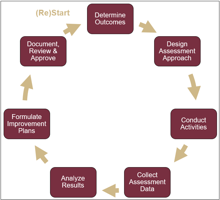 While the process of improvement is always continuous and ongoing, we only document results and analysis of Program Outcomes and Student Learning Outcomes once a year, at the end of each unit’s assessment cycle. Each campus unit determines the best start and end dates for their IE timeline. Generally, educational programs operate on academic year timelines. Common academic year cycle timeframes are: 1) Fall and Spring semesters, 2) Fall, Spring, Summer semesters, 3) Summer C, Fall, Spring, Summer A & B semesters.