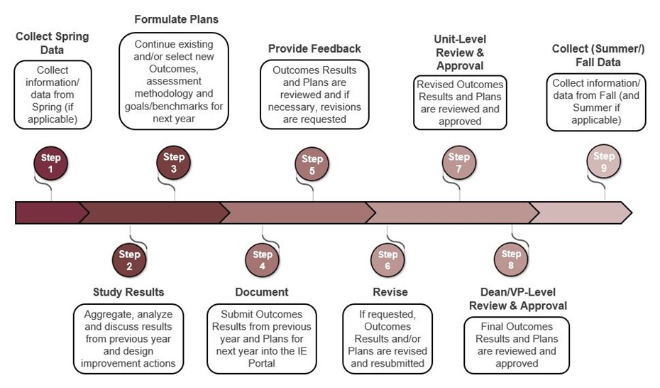 The general timeline for completing various components of the assessment cycle is visualized below. Each university Division and College has its own recommended calendar for engaging in each step of the process. All campus units are allowed and encouraged to complete their assessment process before the specified deadlines.