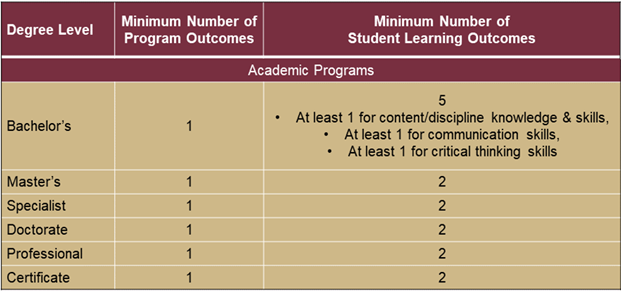 Each educational program (academic degree or certificate) is required to formulate at least 1 Program Outcome (PO) and at least 2 Student Learning Outcomes (SLOs), with the exception of Bachelor's degrees. At the Bachelor's level, due to increased accountability for undergraduate educational outcomes, programs are requested to articulate at least 5 SLOs, 3 of which must be assessed in 3000-4000 level courses and focus on 3 different categories from the following list: content/discipline knowledge and skills, communications skills, critical thinking skills.