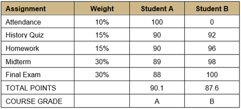 The table below illustrates how one student who better mastered course content nonetheless received a lower overall grade because they did not receive points for consistent attendance. Even if the instructor excludes attendance from the final grade calculation, it would still be impossible to discern if two students who received As have learnt the same content/skills to the same level of mastery. Maybe Student A correctly answered all midterm and final exam questions on disciplinary models and theories definitions but struggled with questions on how these models and theories apply to real-world scenarios, while Student B demonstrated higher mastery of the application skills but was confusing some definitions and terms that required memorization.